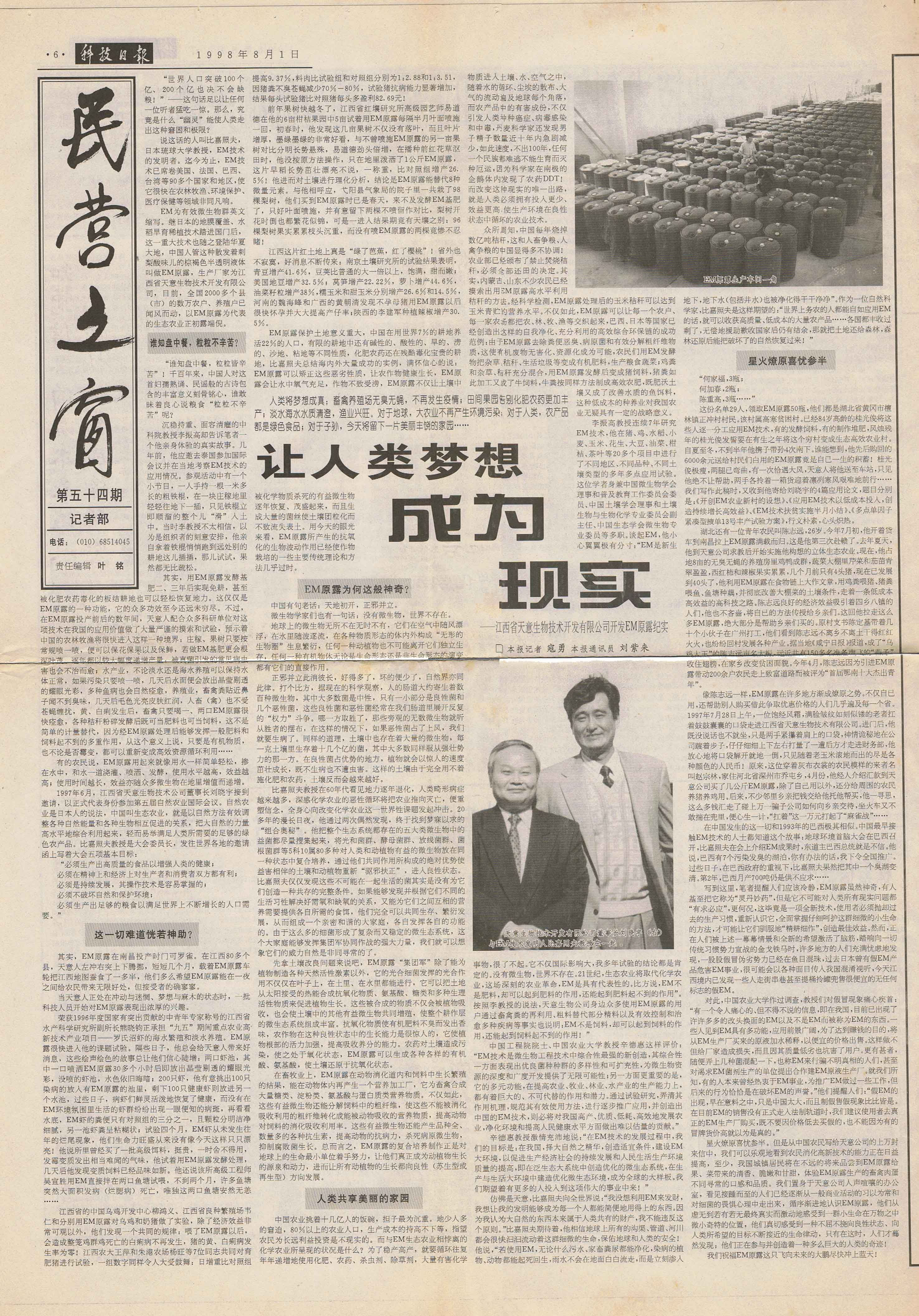 1997 1997年,継《中國畜牧水產報》、《科技日報》、《經濟參考報》、《江西日報》等媒體發表長篇通訊《EM原露正在改變世界》,各省科技、農業報刋均紛紛轉載,EM原露在江西最初的使用效果迅速在全國范圍內興起了一股熱潮,兩年內共簽定縣級代理合同500余家。