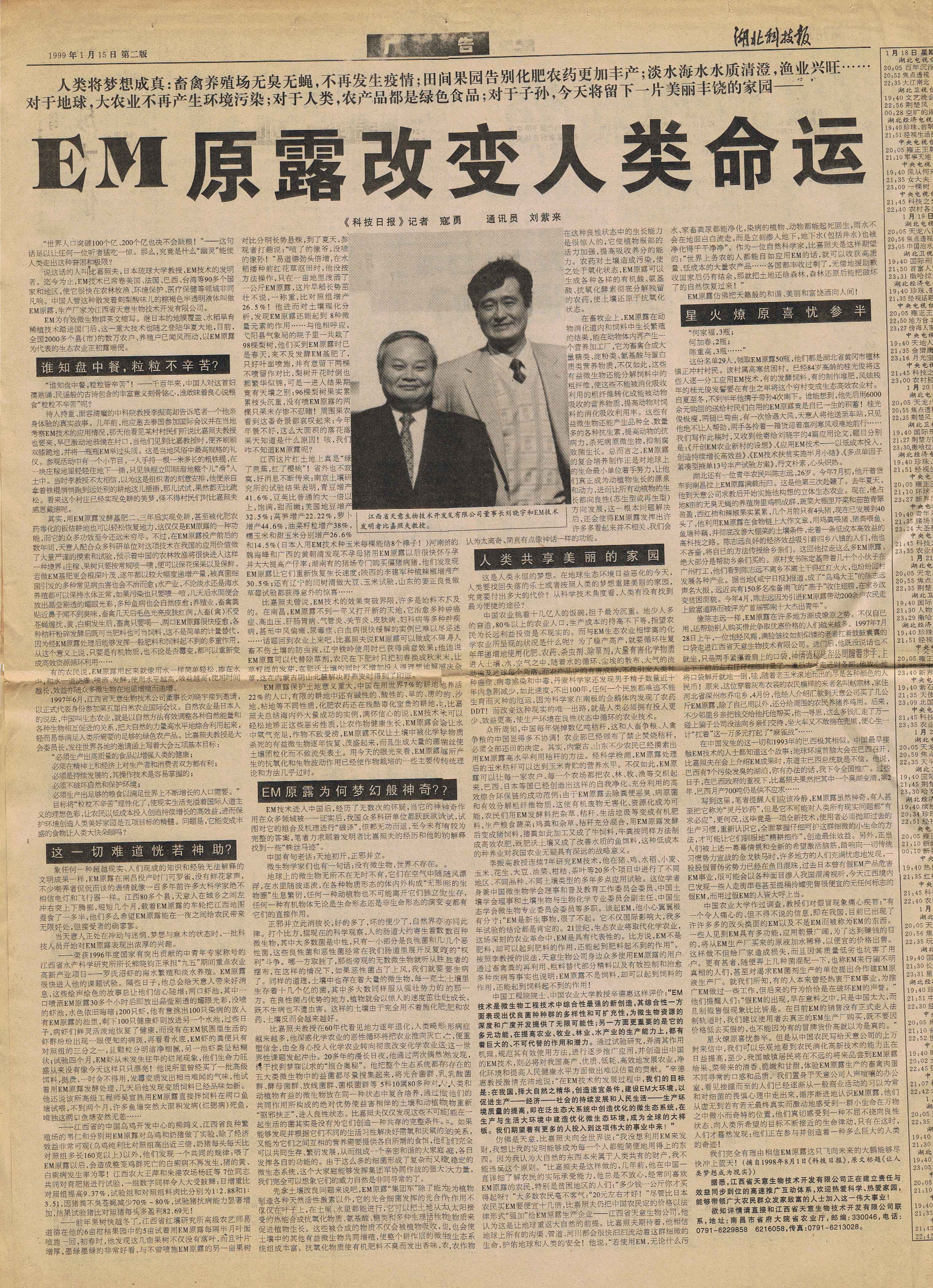 1999 1999年初,中央人民廣播電臺每天早晚對農村廣播的黃金時間開始播放全國各地農民使用EM原露的小故事,在該臺農村部撤消之前的六年時間里,每天播放農民們的自發來信在全國農村引起了廣泛反響。多地政府部門開始自主下文推廣EM原露。